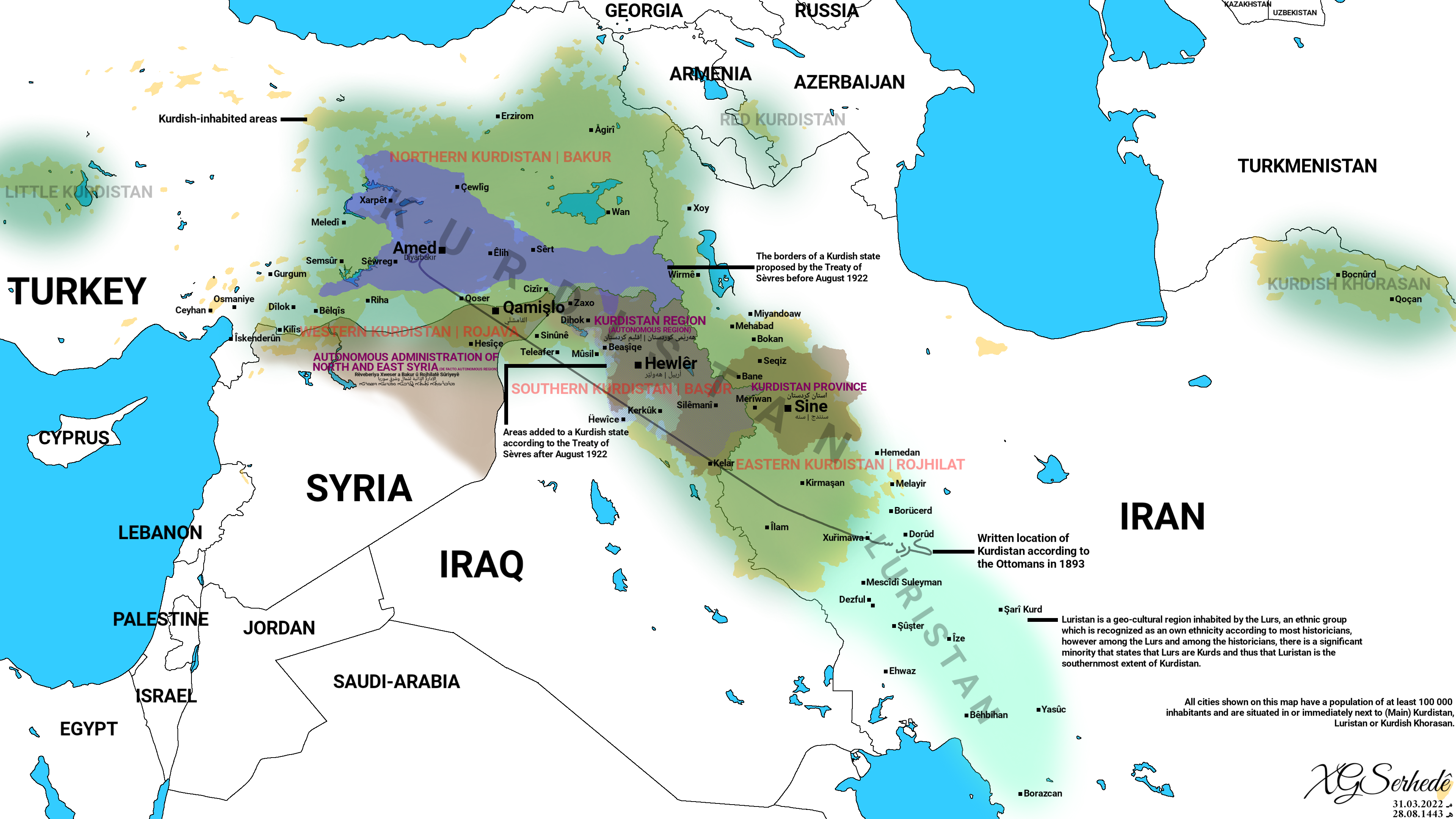 Kurdistan compared to the borders proposed by the Treaty of Sevres before August 1922. Overlay of Kurdish populated area (unknown date).
